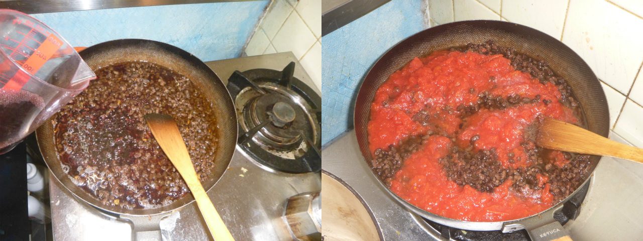 娘さんの誕生会。リクエストは、スパゲッティミートソースだったので、まずは挽肉を焦げるほど炒めてからワインで煮込み、然る後、トマトを加えて更に煮込む。