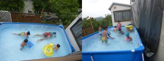 とは言え、水を張るのは半日以上かかる。まずまず、水が溜まったので待ってましたと、午後6時を当にまわっていたのに、ワイフを始め水着に着替えて入水する元気な人達。7月23日(土)