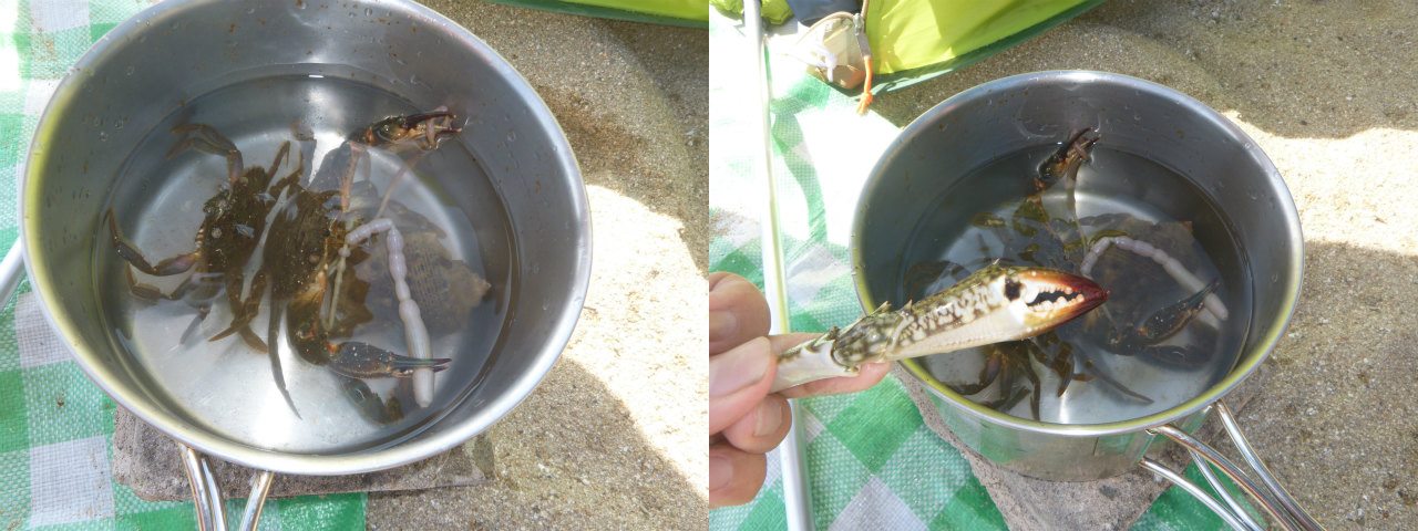 イシガニとアカニシが採れたので、昼食にした。結局、ワタリガニは両腕をパージして逃げてしまったので、腕だけを頂いた。アカニシは、サザエより数倍美味で、殻の螺旋が美しいので、実はいつも殻を持って帰って集めている。