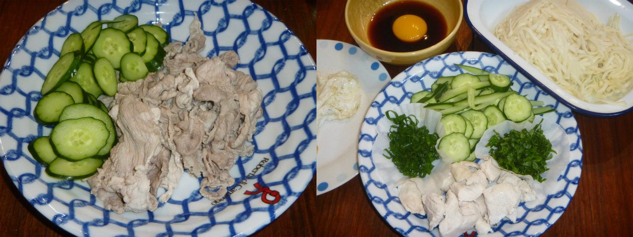 下旬には夏らしくなってきたので、お昼ご飯には夏らしい減量食っぽいものを食べた。最近は肉類は総じて、できるだけ茹でてから食べるようにしている。一味抜けてしまいそうな気もするが、味付け後は大した差はなく、体調は良い気がするので、アク抜きオススメ。