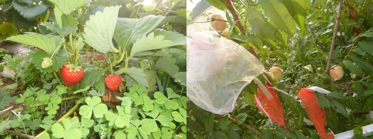 庭に出てケーキのトッピングとデザートを探す。季節外れの四季なり苺。ボチボチ熟れ始めたあかつきという桃。