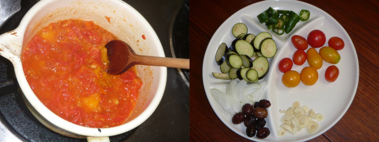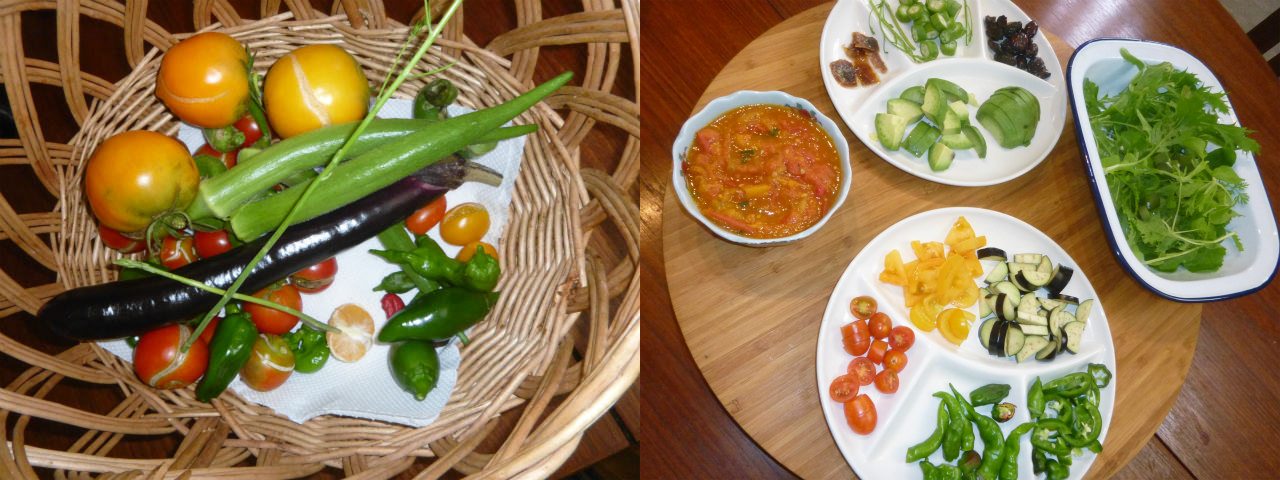 本日の朝飯前。トマトの消費が滞ってきたので、取り敢えず、冷蔵庫で燻っている奴らをトマトソースへ変換。日照りを乗り切った野菜達を収穫。