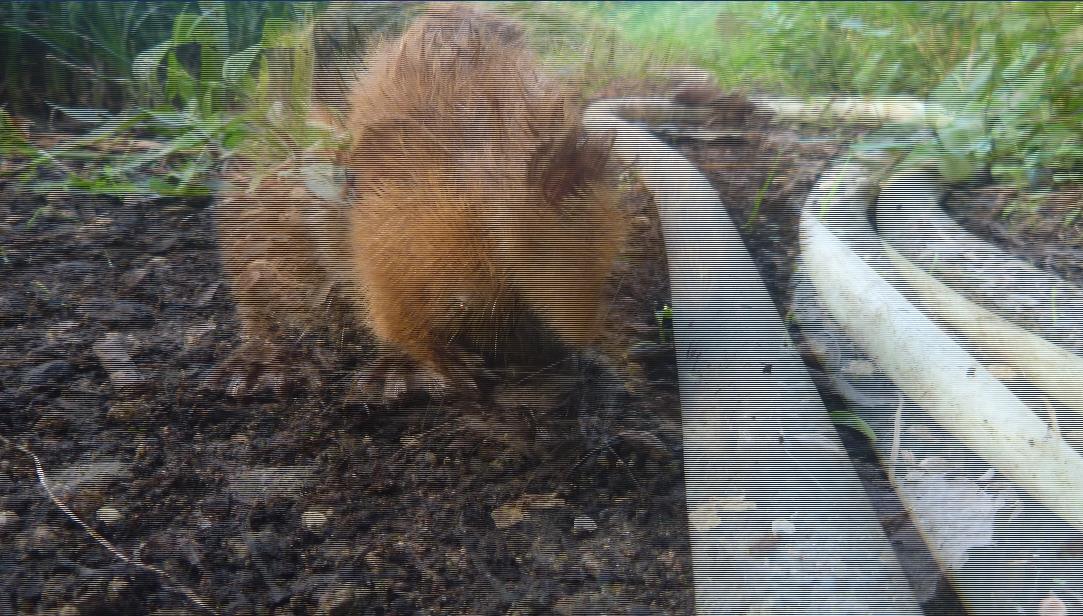 そして、少しばかり、私が動かずにいると、庭のアチコチの隙間や窪みに頭を突っ込んで、食べ物を探し始めた。そもそも自分の射程距離に野生動物を捉えられるとツユとも思っていなかったが、第六感的にも論理的にも、今しかないと一気に間合いを詰めてホウキを振り下ろしたところ、見事な一撃を極めることができた。