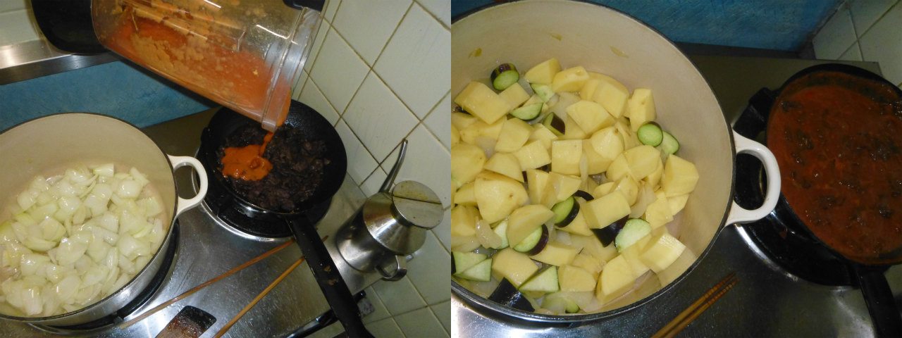 タマネギを甘くなるまで炒めてから、他の野菜を放り込んで炒める。完成したトマトソースをミキサーで滑らかにしてから、ワインで煮込んだ牛肉に加えて更に煮込む。