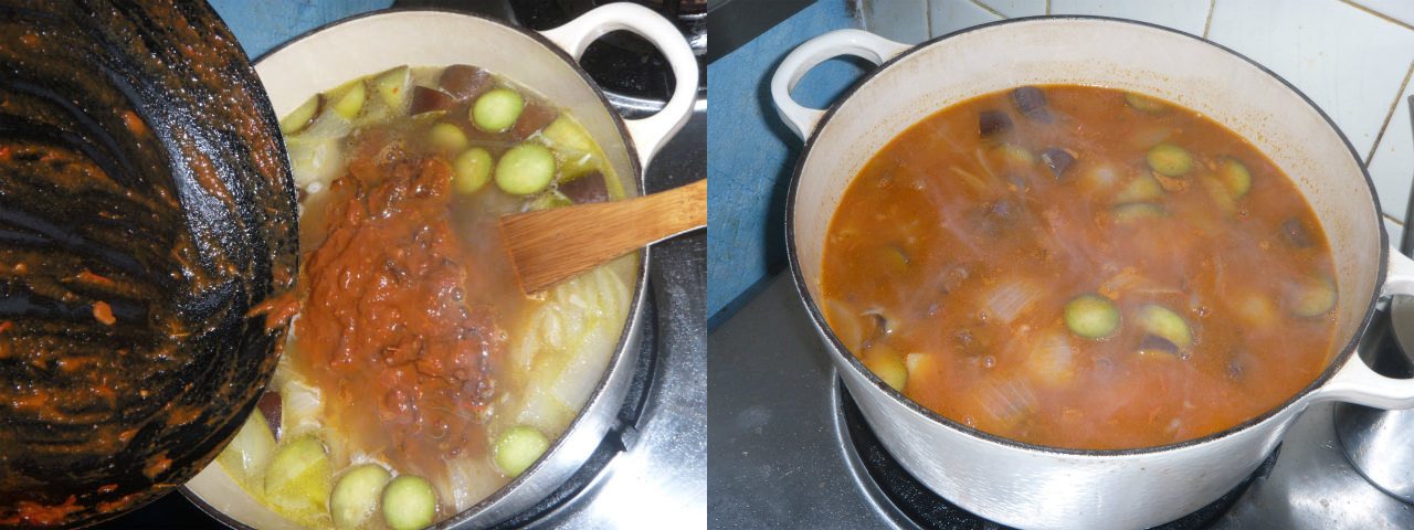 ある程度酸味が薄くなるまで牛肉とトマトソースを煮込み、野菜が入ったメインの鍋へ流し込む。この時点で、既に煮込み料理として食べても美味しいくらいなっていないといけない。