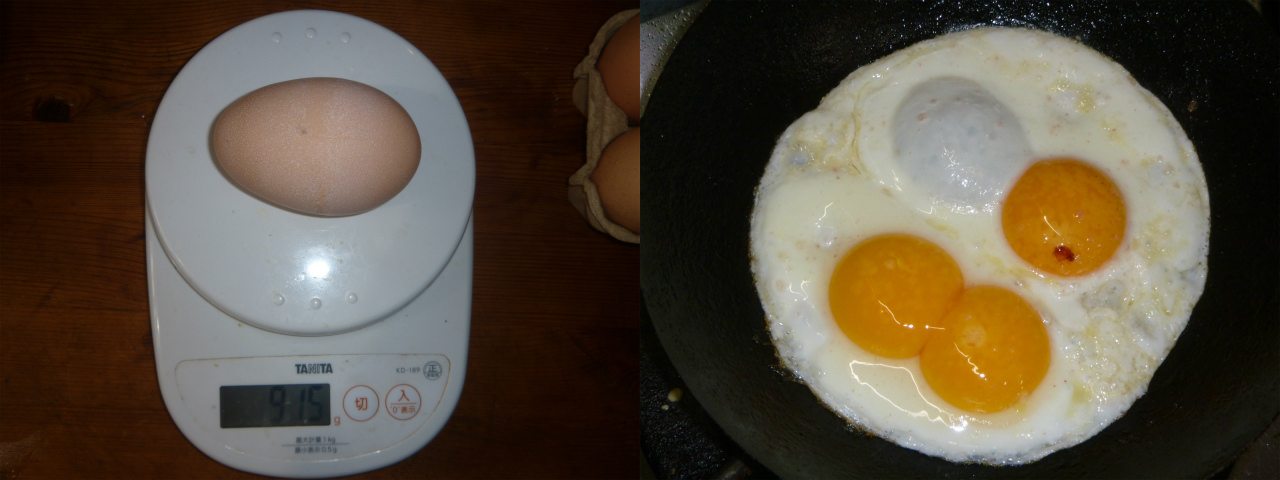 生後、1年目の鶏の卵は60gくらい。3歳くらいになると70g以上になることが多いが、この卵は90g以上。さぞかし、エネルギーを溜めに溜めて産んだのか思ったら、何のことはない、ただの二卵性だった。