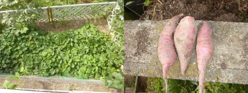 1.「べにはるか」と言う品種のサツマイモが大好き。2.サツマイモの茎は草が生えない冬期における鶏の緑餌の代用となる。と言った理由で、張りきってサツマイモを方々に植えているが本日は一人で試し掘り。【Ex】