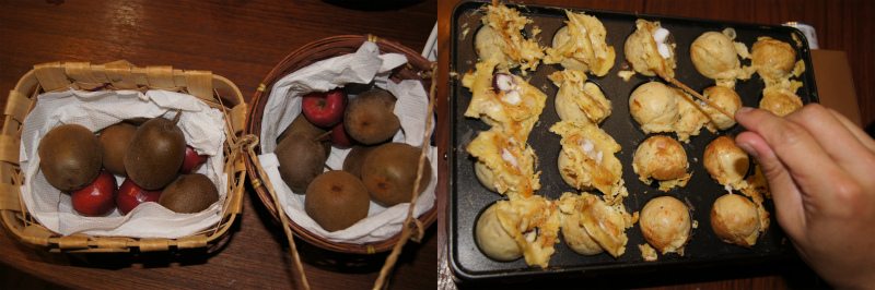 夜、どういういきさつでそうなったかは判らないが、関西なら一家に一台標準装備、関西のレオパレスであれば当然込み込みのたこ焼き器で、タコ焼き大会となった。ちなみに関西では何でも「大会」と呼ぶ。粉が2010年のものだったので、流石に美味しくなかった。左の写真は、ゴールデンキウイをアルプス乙女が発するエチレンガスで追熟させてイルの図。