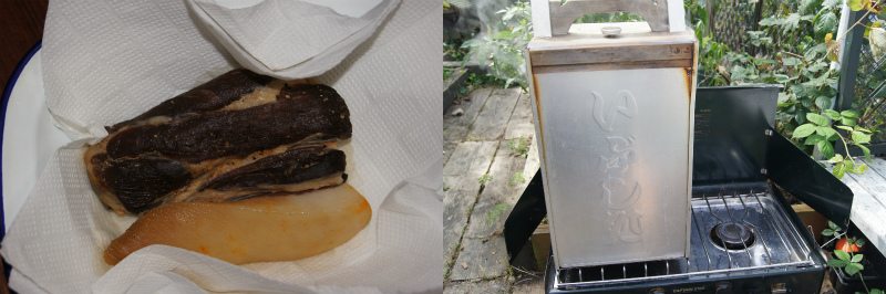 チップはアレなんで30年前のウィスキー樽。時々、温度をチェックしながら、燻すこと数時間。スモーキー&スパイシーなベーコンの完成。