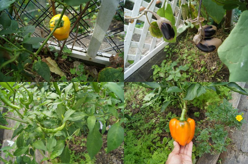 秋なすを通り越したヤセ茄子。夏は全くだったのに秋に入ってから色気づいてきたイエローパプリカとオレンジのパプリカ。そして、大好きな万願寺とうがらし。