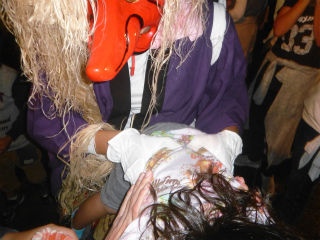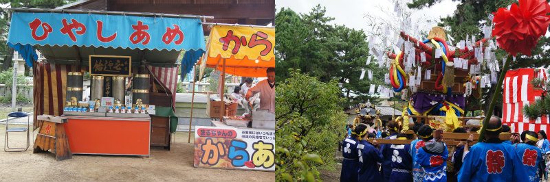 地域の祭。私の住む地区は御輿がないのだが、他の地区の御輿がねりに来てくれる。風習として、「ハナ」と呼ばれる天狗に扮した者達は、子供達に飴をくれるが、小さい子供は大泣きで、これがある種の見物。