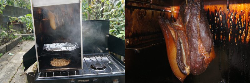 塾講師時代にお世話になった塾長夫妻に燻製を持って行きたいと思い、ソミール液に一週間漬け込んだのち、塩抜きして冷蔵庫で乾かした豚肉をスモーク。