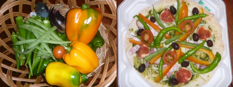 まぁ、そんな訳で、昼飯に魔改造ピザを食するため、具材の調達が始まった。秋なすを通り越したヤセ茄子。夏は全くだったのに秋に入ってから色気づいてきたイエローパプリカとオレンジのパプリカ。そして、大好きな万願寺とうがらし。
