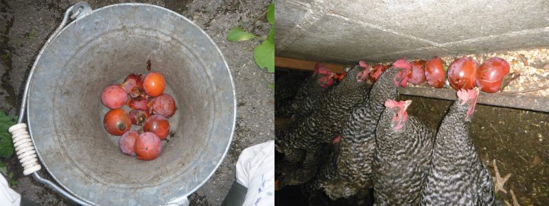 この時期は、毎朝、カキノヘタムシガにやられて落下した柿を拾い歩き、それを餌として鶏に与える。わりと手間であるが、本来は土に還るだけであった果皮や果肉に含まれるβカロチンやβクリプトキサンチン、ゼアキサンチン、リコピンなどの色素は卵黄に利用される為、これらの栄養素を多く含む卵となって自分へと還元される。10月2日(日)