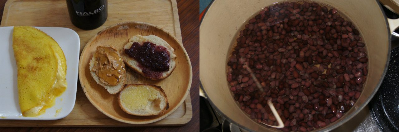 私はこれまでパン担当ではなく、この日、初めてパン作りに挑戦。付け合わせの卵は、トコトン泡立てて砂糖で甘々にしてから焼いたもの。そして、朝から小豆を煮詰める作業にかかる。
