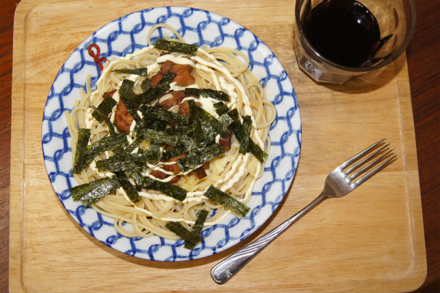 昨日の照り焼きチキンピザ風パスタが発明級に旨かったので、今日の昼もそれ。チキンを茹でてアク抜きしてからカットし、小鍋で甘辛く煮つめる。パスタを茹で、熱々パスタの上にチーズをモッサリ乗せてから照り焼き風のチキンと海苔をトッピングし、最後にヌメ〜とマヨネーズをかける。うわっ、これ、パスタやのに、照り焼きチキンピザやん!ってなるくらい旨い。【Ex】