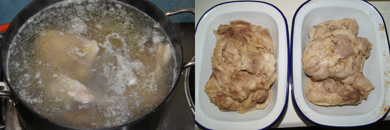 これはなんの図か?大量の鶏もも肉のアク抜きをしている図。湯を沸かし、重曹をひとつまみ入れ、その中へ肉を放り込む。面白いようにアクがとれる。一手間かけれらる人は、実践する価値はある。
