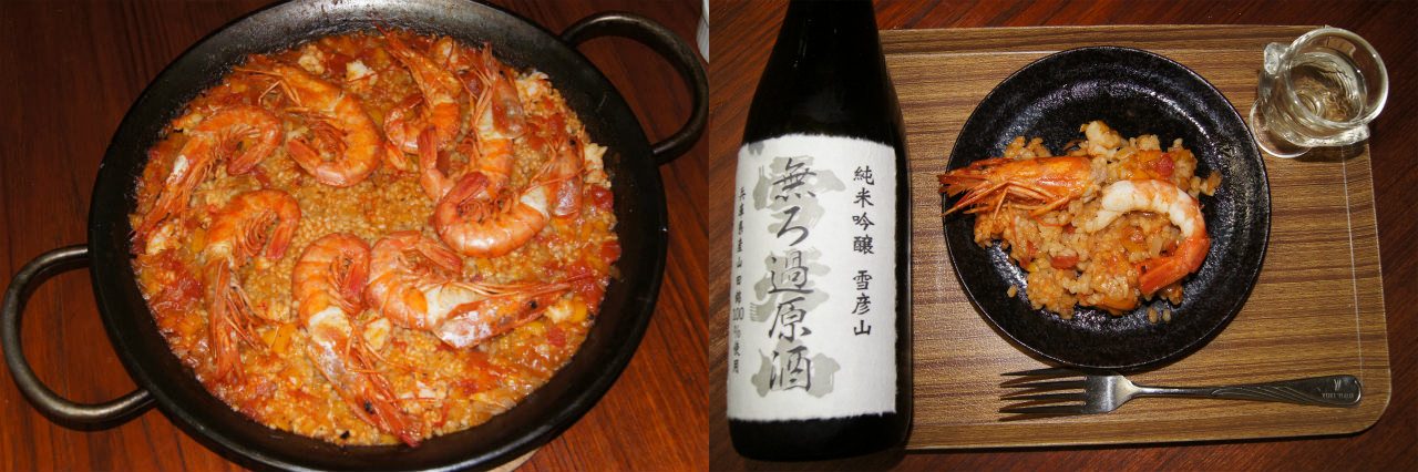 24日にパエリアを食べたばかりであったが、有頭海老が売られていたので、今夜もパエリア。シェリー酒がなくても、日本酒がその代わりになる。