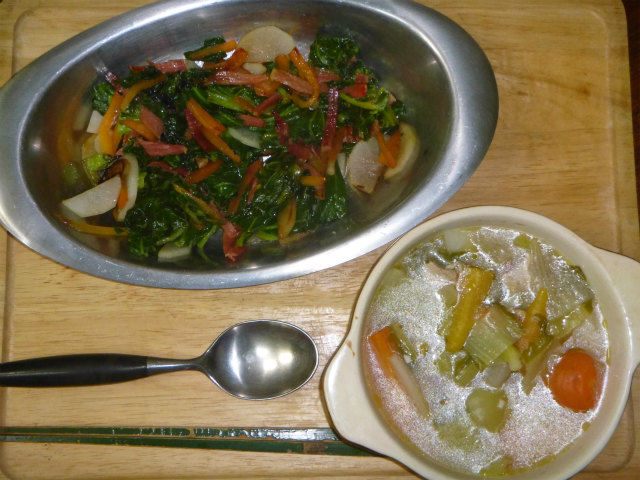 これはなんの図かというと、庭であまり気味の白菜、大根、チンゲンサイ、人参を使いまわして2品作ったの図。