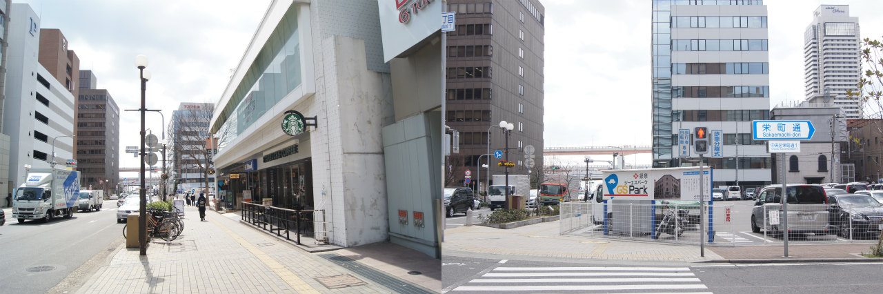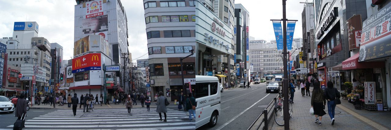 駅前の交差点の様子です。・・・2マクドナルドの看板に従い、南へ歩くと、直ぐに大丸が見えてきます。