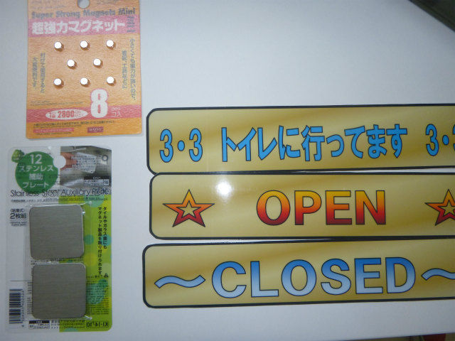 サプマス神戸店の扉にかけるオープン、クローズを知らせる札をどうやって取り付けようかと思案。パンチなどで穴を空けて紐を通して、扉に設置したフックに吊す方式にしようと思ったが、100均にステンレスシールが売っていたので、札をネオジウムでパチンと脱着できる様に細工した。・・・が、全然、使いこなしておらず、常に「OPEN」。