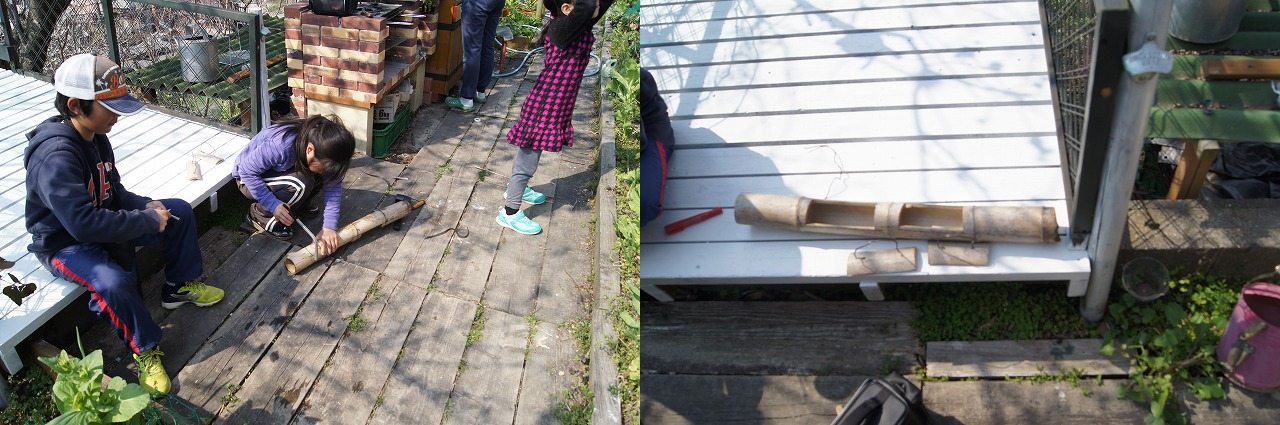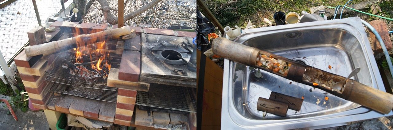 春休み中に私が休みの日を狙って我が家で野外料理をしようと、娘さんが学友達を招待。竹飯盒をすることにした。