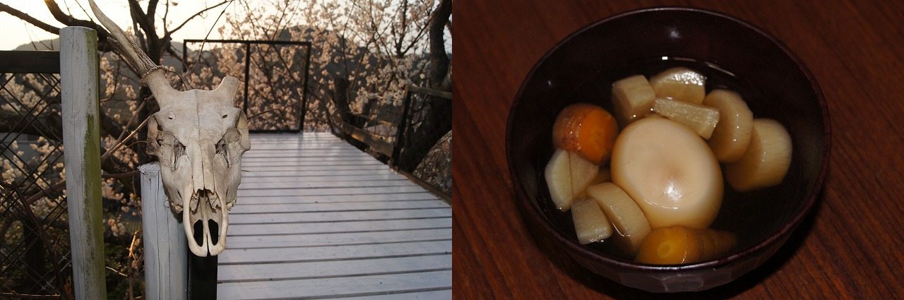 で、件の鹿の頭蓋骨は、庭の飾に収まった。最初に発見した子に譲ってもらったのだ。あっさりと私にくれた理由は、彼の父が趣味でハンターをしているので、珍しくも何ともなかったからだ。夜、庭野菜がトウダチ始めているので、慌てておでん風味の野菜スープを作ったら、大人気だった。【Ex】