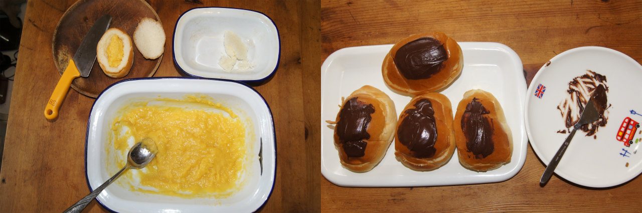 幼稚園の後、直ぐさま体操教室へ向かう息子はんの為に、カスタードクリームをこさえ、パンをくり抜いて詰めて、エクレア風を作った。娘さんは、私のカスタードを好まないが、エクレア風にしたら食べる。