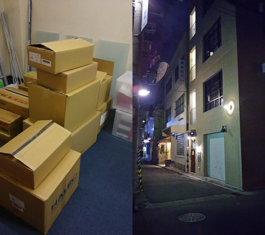 夜中に神戸まで飛ばして什器の搬入を行った。1階から3階の部屋まで、20往復くらい。